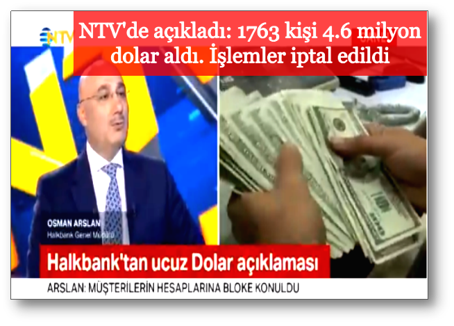 Halkbank Genel Müdürü osman arslan NTV canlı yayınında yaptığı açıklamada 1256 kişinin 3.3 milyar dolar, 124 kişinin 534 bin avro, 383 kişinin diğer döviz işlemlerinden 689 bin dolar olmak üzere toplam 1763 kişinin 4.6 milyon dolarlık döviz alımı gerçekleştirdiğini söyledi. Önceki gece 22.01 ile 22.39 saatleri arasında 3.72 TL'den yapılan dolar işlemlerinin iptal edildiğini ifade eden Arslan, hesapların bloke edilip, işlemlerin iptal edildiğini ve eski haline döndürüldüğünü duyurdu.Halkbank Genel Müdürü Osman Arslan'ın NTV canlı yayınında yaptığı açıklamanın detaylı notları şu şekilde:Bankamızın dijital kanallarında gerek bilgilendirme amaçlı, gerekse döviz alım satım işlemlerinde kullanılmak üzere yayınlanan kurların sisteme aktarılmasında kullanılan dış veri kaynağı Bloomberg’de meydana gelen sistemsel bir hatanın zincirleme etkisi nedeniyle, 31.08.2018 akşamı piyasa kapanışı sonrasında, bankamız döviz kurları kısa bir süre için olması gerekenden daha düşük seviyelerden yayınlanmaya başlamıştır.Yapılan ilk incelemede, sorunun Bloomberg sisteminden otomatik olarak alınan kura esas verilerin hatalı olmasından kaynaklandığı anlaşılmıştır. Hatalı kurlar saat 22.01 ile 22.39 aralığında kısa süreli olarak işlem görmüş, bazı müşterilerimiz dijital kanallardan yaptıkları döviz alım satımlarını bu hatalı kurlar üzerinden gerçekleştirmiştir. Sorunun tespit edilmesi üzerine, döviz alım satım işlemleri geçici olarak kapatılmış, kısa sürede alınan tedbirlerle sistemde doğru kurların uygulanması sağlanmıştır.Söz konusu saat aralığında, piyasa koşullarının tamamen dışında, teknik bir hatadan kaynaklanan düşük seviyeli döviz kurları kullanılarak müşteriler tarafından yapılan döviz alım satım işlemleri kısa süre içerisinde tek tek belirlenmiştir. Buna göre,
