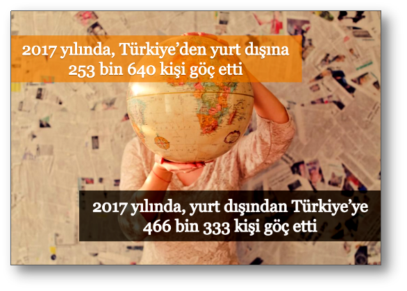 Türkiye'de ikamet eden nüfusun vatandaşlık ve doğum ülkesine göre dağılımı, Adrese Dayalı Nüfus Kayıt Sistemi'nden yıllık olarak üretilmektedir. Bununla birlikte, idari kayıtlardan elde edilen istatistiklerin geliştirilmesi kapsamında mevcut kayıtlar üzerinde yapılan analiz çalışmaları sonucunda, yıllık göç akış istatistikleri olarak tanımlanan yurt dışından gelen ve yurt dışına giden göç bilgisi, Türkiye İstatistik Kurumu tarafından 31 Aralık tarihi referans alınarak idari kayıtlara dayalı olarak ilk kez üretilmiştir.Uluslararası alanda her geçen gün daha da önem kazanan göç olgusunun ekonomik, siyasi, demografik, sosyal ve kültürel etkileri bulunmaktadır. Demografi alanında yürütülen çalışmalarda, ulusal ve yerel düzeyde sosyo-ekonomik plan ve politikaların belirlenmesi ile göç yönetiminde yıllık göç akış istatistikleri önemli bir yere sahiptir.Yurt dışından Türkiye’ye 466 bin 333 kişi göç ettiTürkiye’ye göç edenlerin sayısı 2017 yılında bir önceki yıla göre %22,4 artarak 466 bin 333 kişi oldu. Bu nüfusun %52,3'ünü erkek, %47,7'sini ise kadın nüfus oluşturdu.Türkiye’den yurt dışına 253 bin 640 kişi göç ettiTürkiye’den göç eden kişi sayısı 2017 yılında bir önceki yıla göre %42,5 artarak 253 bin 640 oldu. Bu nüfusun %54'ünü erkek, %46'sını ise kadın nüfus oluşturdu.Türkiye’ye gelen ve Türkiye’den giden göçün cinsiyete göre