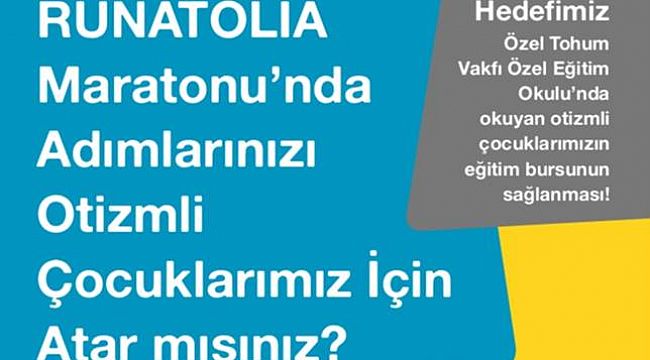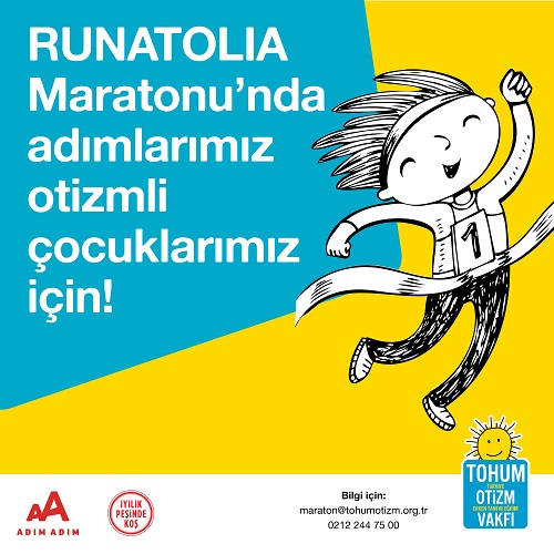 Tohum Otizm Vakfı’nın 7. kez katıldığı Runatolia Maratonu’nda bireysel ve farklı firmaları temsil eden gönüllü koşucular; koşarak veya yürüyerek, adımlarını otizmli çocuklar için atacak, maratonun öncesinde ve sonrasında, toplamda 1 ay süresince sosyal çevresinden topladığı bağışlarla otizmli çocukların eğitimine katkı sağlayacaklar.Otizmin bilinen tek çaresinin “erken tanı ile yoğun ve sürekli eğitim” olduğuna dikkat çeken Tohum Otizm Vakfı Genel Müdürü Suat Kardaş “Bugün dünyada her 59 çocuktan 1’i otizm riski ile doğuyor. Bu rakam her yıl artış eğilimi gösteriyor. Runatoila Maratonu’nda koşarak hem otizm konusunda farkındalık yaratabilir hem de otizmli çocuklarımızın eğitimi için bağış toplayabilirsiniz. Tüm sporseverleri Runatolia Maratonu’nda yanımızda olmaya davet ediyoruz.” dedi.