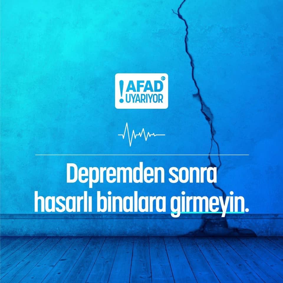 Afet ve Acil Durum Yönetimi Başkanlığı ( afad ) deprem sonrası uyarıyor. AFAD yaptığı paylaşımda hasarlı binalara girilmemesi gerektiği konusunda uyarıda bulundu.