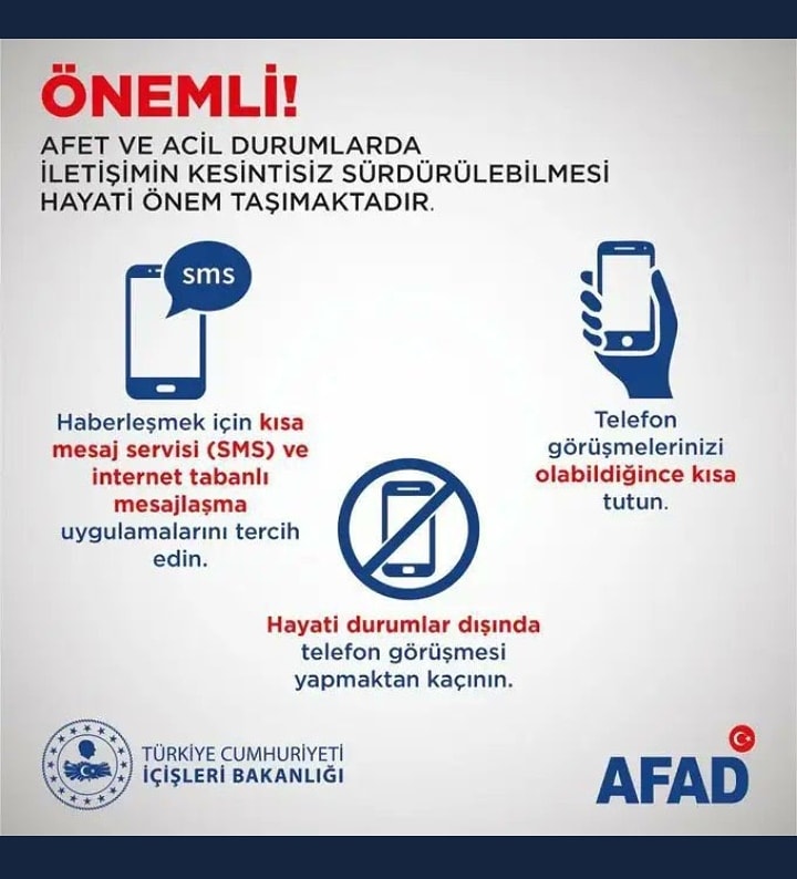 Ayrıca AFAD deprem sonrası haberleşmenin önemli olduğunu ve bu yüzden gerekmediği sürece özel görüşmeleri uzun tutulmaması gerektiğini belirtti.