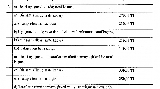 Buna göre, özel hukuk uyuşmazlıklarının arabuluculuk yoluyla çözümlenmesinde, arabulucu ile uyuşmazlığın tarafları arasında geçerli bir ücret sözleşmesi yapılmadığında veya ücret miktarı konusunda arabulucu ile taraflar arasında ihtilaf bulunan durumlarda 6325 sayılı Hukuk Uyuşmazlıklarında Arabuluculuk Kanunu, Hukuk Uyuşmazlıklarında Arabuluculuk Kanunu Yönetmeliği ve bu tarife hükümleri uygulanacak.Aile hukuku, işçi-işveren ve tüketici uyuşmazlıklarında arabulucuya taraf başına saatlik (ilk üç saate kadar) 140 lira, takip eden her saat için 100 lira ödenecek.Bu ücret ticari uyuşmazlıklarda saatlik (ilk üç saate kadar) 270, takip eden her saat için 210, ticari uyuşmazlığın taraflarının tümü sermaye şirketiyse saatlik (ilk üç saate kadar) 330, takip eden her saat için 250, diğer tüm uyuşmazlıklarda saatlik (ilk üç saate kadar) 170, takip eden her saat için 130 lira olacak.Avukatlık Asgari Ücret Tarifesi’nde indirim yapıldıTürkiye Barolar Birliği tarafından hazırlanan 'Avukatlık Asgari Ücret Tarifesi'nde yapılan değişiklik Resmi Gazete'de yayımlandı. Buna göre seri davalarda hesaplanan tarife oranları yüzde 10 düşürüldü.Türkiye Barolar Birliğince hazırlanan "Avukatlık Asgari Ücret Tarifesinde Değişiklik Yapılmasına Dair Tarife" Resmi Gazete'de yayımlandı. Buna göre, seri davalarda her bir dosya için ayrı ayrı tam ücret üzerinden hesaplanan tarife oranları yüzde 10 düşürüldü.Bir başka değişiklikle sulh hukuk mahkemelerinde takip edilen davalar için 990 lira olan tarife ücreti ise 850 liraya indirildi.