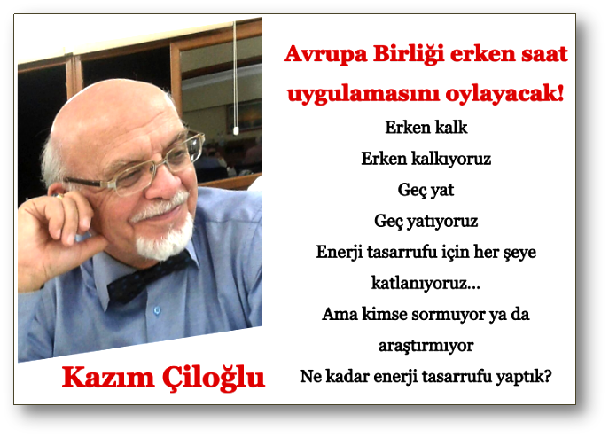 AB meclis başkanı Juncker, Alman televizyonuna bu konuda yapılan geniş kapsamlı araştırmalara değinen başkan, halkın bu konuda ve özellikle çocukların, uzun vadede biyolojik açıdan olumsuz etkilendiğini savunduklarını belirterek, uygulamanın oylama sonucunda kalkabileceğine dikkat çekti.Biz ise ne söylenirse, ne istenirse eyvallah diyip anında uyguluyoruz!Erken kalkErken kalkıyoruzGeç yatGeç yatıyoruzEnerji tasarrufu için her şeye katlanıyoruz…Ama kimse sormuyor ya da araştırmıyorNe kadar enerji tasarrufu yaptık?Kaç milyon kilovat ya da bunun dolar ve TL karşılığı ne kadar bir maddi değerdir?Bu maddi değerin seksen milyonu esas alarak kişi başına ya da dört kişilik ortalama bir aile başına günlük ya da aylık oranı nedir?Bilmem anlata bildik mi?Ama elin yabancısı oturup, koskoca Avrupa kıtasında bilimsel anketler yapıyor ve sonuçlarına, halkın eğilimlerini de katıp meclisine taşıyor. İmrenmemek ve kıskanmamak elde mi?Kesinlikle inanıyorum ki bu incelemede horozlar en önemli yeri almıştır!Bizde ise bul karoyu al parayı misali ben yaptım oldu yöntemi yürürlükteAnlayacağınız, ben yaptım oldu yöntemi, bilgilenmenin de, bilimselliğinde önünü kesmekle kalmıyor, ileriye dönük yanlışlarında devamını sağlıyor.Umarız ve dileriz ki oldukça düzenli ve dört mevsimi yaşayan bir konumda bulunan ülkemizde bu konuda bir araştırma yapar ve sonuçlarını bilimsel panellerde tartışarak doğru sonuçlara ulaşırız.Sözün özü;Biyolojik dengelerde ki bozulmalar çok daha fazla ekonomik harcamalarla düzeltilebilir. ‘’Dimyat’a pirince giderken evdeki bulgurdan olmak’’ sözünü...Yazının tamamı için tıklayınız