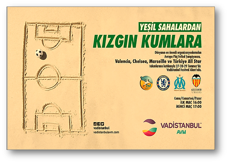 Yazı İstanbul’da geçirenler için sahil havası estirecek, zorlu mücadelelerin ve yüksek heyecanların yaşanacağı uluslararası boyutta muhteşem bir turnuva Vadistanbul’da başlıyor. Türkiye Futbol Federasyonu’nun onayı ile Beach Soccer Turkey tarafından Türkiye’de 5.’si düzenlenen avrupa plaj futbolu Şampiyonası İstanbul Cup 2018; vadistanbul Festival Alanı’nda 550 ton kum getirilerek hazırlanan kum zeminde, 27 Temmuz Cuma günü, ilk düdüğünü çalıyor. İspanya’dan Valencia CF, İngiltere’den Chelsea, Fransa’dan Marseille takımlarının katılacağı Avrupa Plaj Futbolu Şampiyonası İstanbul Cup 2018’de Türkiye’yi ‘Türkiye All Star’ temsil edecek.Her gün iki maçA Spor’dan canlı yayınlanacak olan maçlar; 27 Temmuz Cuma, 28 Temmuz Cumartesi ve 29 Temmuz Pazar günü oynanacak. Her gün iki maçın düzenleneceği turnuvanın ilk maçı saat 16.00’da, ikinci maçı ise saat 17.00’de oynanacak.Tüm maçlar Vadistanbul’da kurulu olacak yaklaşık 2 bin kişilik tribünde ücretsiz olarak izlenebilecek.İstanbul Cup 2018 Plaj Futbolu Turnuvası Fikstürü:1. GÜN - 27.07.201816:00 Valencia vs Marseille17:00 Türkiye All Star vs Chelsea2. GÜN - 28.07.201816:00 Chelsea vs Valencia17:00 Marseille vs Türkiye All Star3. GÜN - 29.07.201816:00 Marseillevs Chelsea17:00 Türkiye All Star vs Valencia