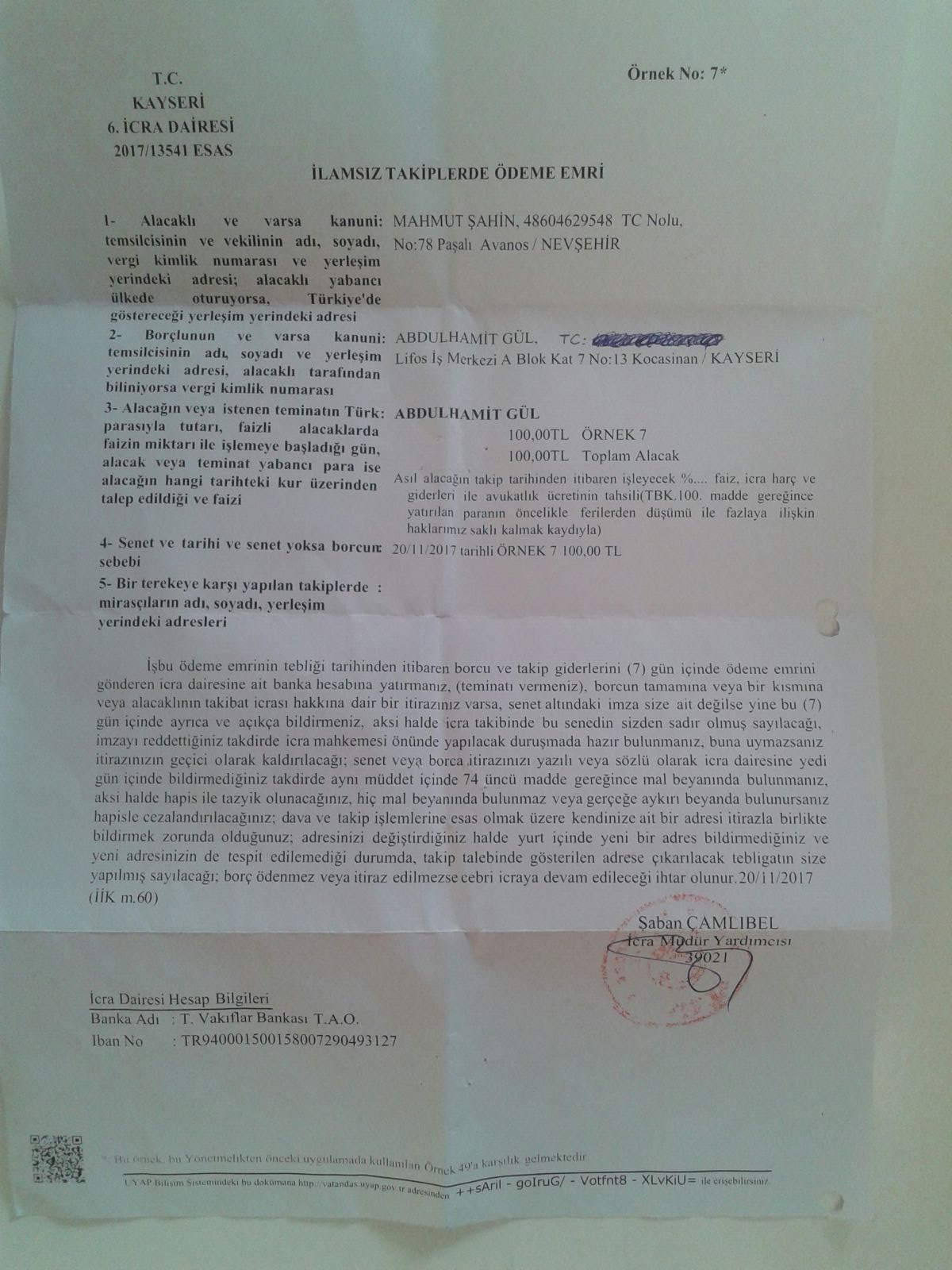 abdulhamit gül Bey’in eline geçmediği için itiraz edemedi ve şu anda bu icra takibi kesinleşti. Ben şu anda istersem Abdulhamit Bey’in maaşına ya da arabasına haciz koyabilir”.
