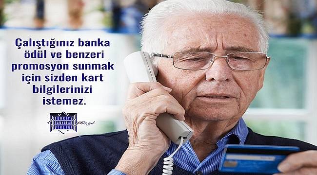 Cezalara rağmen, dolandırıcılar boş durmuyor. Özellikle yaşlı ve emeklileri seçen dolandırıcılar, 'Telefonda ödül kazandınız vb' cazip konuşmalarla kişilerin kart ve kimlik bilgilerini istiyorlar. Ancak Türkiye Bankalar Birliği (TBB) bu konuda da tüketicilere çok önemli bir hatırlatma yaptı. İşte o hatırlatma: Çalıştığınız banka ödül ve benzeri promosyon sunmak için sizden kart bilgilerinizi paylaşmanızı istemez. Bu bilgileri isteyenlere karşı dikkatli olun. Kart bilgilerinizin korunmasından sorumlu olduğunuzu unutmayın.(Tüketici Postası)