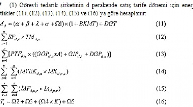 | Enerji Piyasası Düzenleme Kurumundan:PERAKENDE ENERJİ SATIŞ FİYATLARININ DÜZENLENMESİ HAKKINDATEBLİĞDE DEĞİŞİKLİK YAPILMASINA DAİR TEBLİĞMADDE 1 – 30/12/2015 tarihli ve 29578 sayılı Resmî Gazete’de yayımlanarak 1/1/2016 tarihinde yürürlüğe girmiş olan Perakende Enerji Satış Fiyatlarının Düzenlenmesi Hakkında Tebliğin 17 nci maddesi aşağıdaki şekilde değiştirilmiştir.“MADDE 17 – (1) Görevli tedarik şirketinin d perakende satış tarife dönemi için enerji tedarik maliyeti (ETMd) aşağıdaki eşitlikler (11), (12), (13), (14), (15) ve (16)’ya göre hesaplanır: