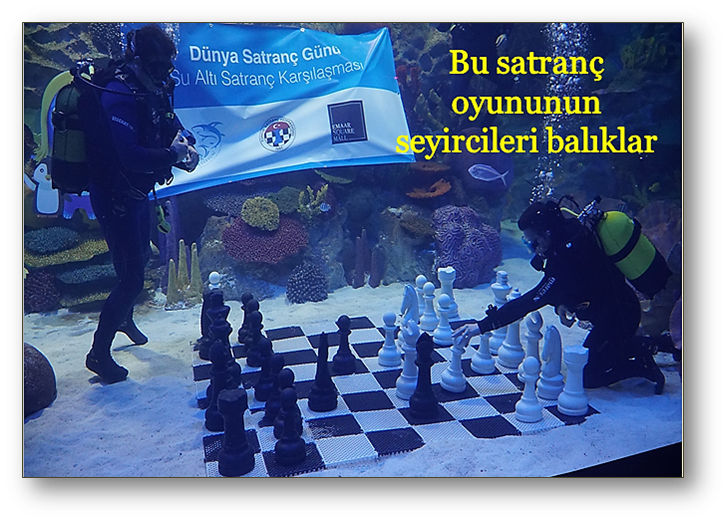 Emaar Akvaryum ve Sualtı Hayvanat Bahçesi ve Türkiye Satranç Federasyonu (TSF) “20 Temmuz Dünya Satranç Günü”nü sualtında gösteri maçı ile kutladı. Büyük ilgi ile takip edilen etkinlikte satranç sporcuları akvaryum içerisine kurulan dev satranç seti üzerinde kıyasıya mücadele ederken; vatoz ve yüzlerce çeşit deniz canlısı arasında gerçekleştirilen maç renkli görüntülere sahne oldu.
