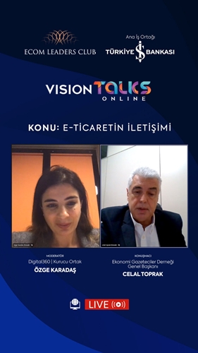 Digital360 Kurucu Ortağı Özge Karadaş’ın moderatörlüğünde düzenlenen 6. Vision Talks, ekonomi gazetecileri derneği (EGD) Başkanı Celal Toprak’ı ağırladı. 8 Kasım Pazartesi günü saat 20:00’de online ortamda canlı olarak düzenlenen online etkinlikte Ekonomi Gazetecileri Derneği Başkanı celal toprak konuk oldu. Celal Toprak, “E-Ticaretin İletişimi” başlığında önemli değerlendirmeler yaptı.