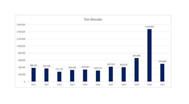 2021 yılına gelindiğinde ise geride bırakılan 8 aylık süreçte büyük çaplı depremler yaşanmadığı için basına yansıyan deprem haberleri toplamı 499 bin 868 olarak gerçekleşti.