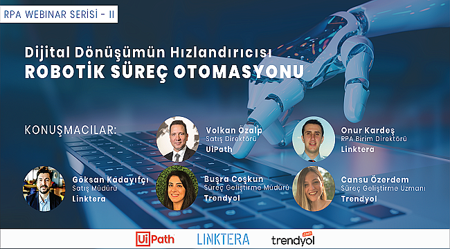 Türk mühendislik ve yazılım şirketi linktera ve global yazılım şirketi UiPath’in iş birliğiyle düzenlenen “Dijital Dönüşümün Hızlandırıcısı Robotik Süreç Otomasyonu” başlıklı webinarda Trendyol’un robotik süreç otomasyonu yatırımları başta olmak üzere Türkiye'deki 200’den fazla uipath Robotik Süreç Otomasyonu projesinin çıktıları değerlendirildi. Linktera RPA Birim Direktörü Onur Kardeş etkinlikte şu sözleri ifade etti: “Yakın gelecekte hiper otomasyon sayesinde çok daha büyük kapasiteler ve kabiliyetlerden bahsedebileceğiz ve bunun sayesinde kuralladığımız sistemin ötesine geçeceğiz.” UiPath Satış Direktörü Volkan Özalp ise araştırmaların 2025 yılında insan ve robot sayısının şirketlerde eşit olacağını ve robotların artık insanları destekleyecek birer asistan durumunda olacağını belirtti.Küresel pandemi nedeniyle çalışma alışkanlıkları ve iş yapış şekillerinin uğradığı değişim neredeyse her sektörde gözlemlenebiliyor. Bir yandan bazı şirketler dijital dönüşüm sürecine yeni başlarken bazıları ise bu süreçleri hızlandırmaya ve iş yapış yöntemlerine yeni bakış açıları getirmeye devam ediyor. Ürününü ya da hizmetini dijital ortamda gelire dönüştürebilen ve operasyonlarında otomasyon sağlayan şirketler kriz dönemlerini daha hafif atlatıyor.Bu dijital dönüşümün ilk adımı ve dijital dönüşüm süreçlerinin hızlandırıcısı olan Robotik Süreç Otomasyonu (RPA) teknolojisi yapay zekâ robotları sayesinde hatasız ve hızlı işlem olanağı sunuyor. Şirketlere sundukları yazılımlarla önemli projelere imza atan Linktera ve UiPath geçtiğimiz günlerde düzenlediği webinarda robot otomasyonu Trendyol’un iş süreçleri üzerinden örneklendirerek geleceğin teknolojisi hiper otomasyonla beklenen değişimleri aktardı.Türkiye’nin en büyük RPA birimlerinden birine sahip olan Linktera RPA Birim Direktörü Onur Kardeş “Bizim için RPA sadece şirketler için süreci teslim ettiğimiz ve bitirdiğimiz iş değil, uzun vadeli bir yolculuk. Bu yolculuğun başında RPA’nın nasıl işlediğini ve nasıl sonuçlar getireceğini müşterilerin kendi ortamlarında gösteriyoruz. Sonrasında eğitim ve atölyelerle onları güncel tutarak bu çözümleri özümsemelerini ve en büyük verimi almalarını sağlıyoruz” dedi.