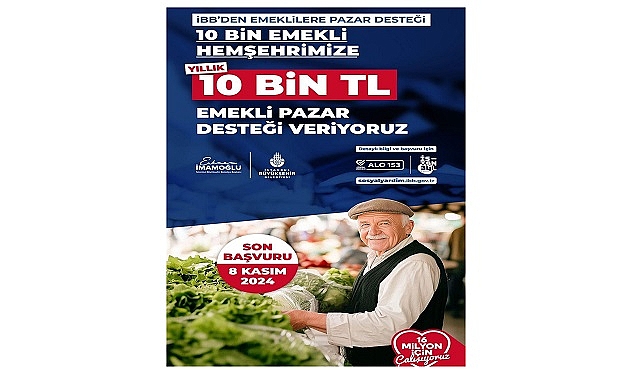 İBB'nin Emeklilere Pazar Desteği başlıyor. İhtiyaç sahibi olduğu tespit edilen toplam 10 bin emekliye, yıllık 10 bin TL pazar desteği sağlanacak. İBB Emekli Pazar Desteğine başvurular 8 Kasım’a kadar İstanbul Senin, https://sosyalyardim.ibb.gov.tr/ sitesi ve Alo 153 Destek hattı üzerinden alınacak.