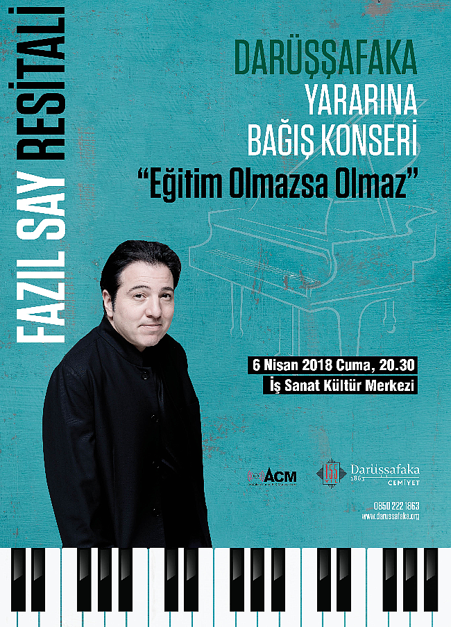 Dünyaca ünlü piyanist ve besteci Fazıl Say, bu kez Darüşşafaka Cemiyeti için çalacak. 1863 yılından bu yana eğitimde fırsat eşitliği anlayışıyla faaliyetlerini sürdüren ve bu yıl 155. yılını kutlayan Darüşşafaka Cemiyeti yararına düzenlenen bağış konserinde Fazıl Say sahne alacak. 6 Nisan Cuma akşamı saat 20:30'da İstanbul’daki İş Sanat Kültür Merkezi'nde gerçekleşecek Fazıl Say resitalinde, sanatçı kendi bestelerini ve çağdaş bestecilerinin eserlerini yorumlayacak.Konserin tüm geliri eğitimeDarüşşafaka Cemiyeti tarafından düzenlenen bağış konserinden elde edilecek tüm gelir, Türkiye’nin dört bir yanından Darüşşafaka Eğitim Kurumları’na gelen; anne veya babası vefat etmiş 1.000’e yakın öğrencinin eğitim masrafları için kullanılacak. Bilet satın alarak, ‘eğitimde fırsat eşitliği’ne destek vermek isteyen müzikseverler, Darüşşafaka Cemiyeti’nin internet sitesi üzerinden bağışlarını gerçekleştirerek biletlerini temin edebilecek.