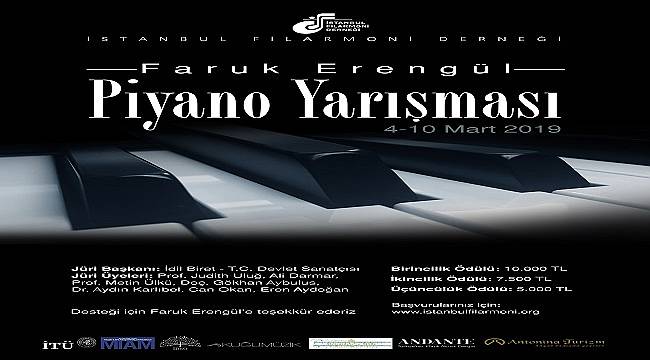 İstanbul Filarmoni Derneği bu kez 4-10 Mart 2019 tarihleri arasında ulusal düzeyde bir piyano yarışma düzenliyor.Geçtiğimiz yıl ilk kez yaylı çalgılar için yapılan ve Cihat Aşkın’ın başkanlığında gerçekleşen yarışma bu kez genç piyanistleri ödüllendiriyor. Yarışmanın jüri başkanlığını ülkemizin en önemli piyanistlerinden T.C. Devlet Sanatçısı İdil Biret üstleniyor. Jüri üyeleri ise, Prof. Judith Uluğ, Ali Darmar, Prof. Metin Ülkü, Doç. Gökhan Aybulus, Dr. Aydın Karlıbel, Can Okan ve Eren Aydoğan.Faruk Erengül’ün değerli desteğiyle 15-30 yaş arasındaki gençlerin katılımına açık olan yarışmanın birincilik ödülü 10.000 TL, ikincilik ödülü 7.500 TL, üçüncülük ödülü ise 5.000 TL. Yarışmanın birincisi ayrıca İstanbul Devlet Senfoni Orkestrası’nın 29 Mart 2019 tarihli konserinin de solisti olacak. İTÜ MIAM Salonlarında gerçekleşecek yarışmayla ilgili tüm detaylar ve başvuru için www.istanbulfilarmoni.org. Son başvuru tarihi 8 Şubat 2019.(Tüketici Postası)