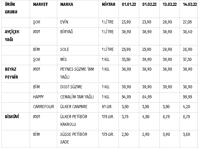 Tüketici Birliği Federasyonu Market Endeksi Çalışma Grubu Başkanı Aygül Öner konuyla ilgili şu açıklamayı yaptı:13.02.2022 tarihli Resmi Gazete’de yayınlanan 5189 sayılı Cumhurbaşkanlığı kararı ile temel gıda ürünlerinden alınan yüzde 8 KDV, 14.02.2022 tarihinden itibaren yüzde 1’e düşürülmüştür.Tüketici Birliği Federasyonu tarafından yaklaşık iki yıldır dile getirilen bu istek ve önerinin yaşama geçmiş olması nedeniyle memnuniyetimizi ve desteğimizi kamuoyu ile paylaşıyoruz.Yasal düzenlemeler gereğince, KDV indiriminin 14.02.2022 tarihinden itibaren etiketlere yansıması gerekmektedir. Stokta olan ürünler, eski oran üzerinden tedarik edilen ürünler bakımından da, 14.02.2022 tarihinden itibaren tüketiciye satışta yüzde 1 KDV uygulanması zorunludur.Geçmişte yapılan geçici KDV indirimlerinde, indirim oranını etiketlere yansıtmayan ve bu şekilde gizli zam ile tüketiciye yansıması gereken vergi indirimini cebine atan fırsatçı yaklaşımların yinelenmemesi için Tüketici Birliği Federasyonu Market Endeksi Çalışma Grubu, 13.02.2022 ve 14.02.2022 tarihlerinde, iki ayrı ilde beş farklı zincir ve yerel markette etiket tespiti yapmıştır.Elde edilen sonuçlar, temel gıda ürünlerindeki KDV indiriminin etiketlere hızlı bir şekilde yansıdığını göstermektedir. Yüzlerce kalem ürünün olduğu satış noktalarında dahi14 Şubat, öğlen saatlerinden itibaren etiket değiştirme işlemlerinin büyük ölçüde tamamlandığı, tamamlanmayan ürünlerin de etiketlerinin değiştirileceği bilgisi alınmıştır.Tüketici Birliği Federasyonu Market Endeksi Çalışma Grubu tarafından 01.01.2022, 01.02.2022, 13.02.2022 ve nihayet KDV indirimi uygulamasının başladığı 14.02.2022 tarihlerinde tespit edilen fiyatlar şu şekildedir: