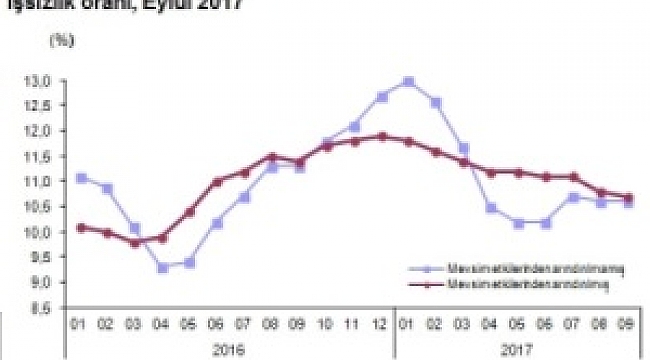 Türkiye genelinde 15 ve daha yukarı yaştakilerde işsiz sayısı 2017 yılı Eylül döneminde geçen yılın aynı dönemine göre 104 bin kişi azalarak 3 milyon 419 bin kişi oldu. İşsizlik oranı 0,7 puanlık azalış ile %10,6 seviyesinde gerçekleşti. Aynı dönemde; tarım dışı işsizlik oranı 0,9 puanlık azalış ile %12,8 olarak tahmin edildi. Genç nüfusta (15-24 yaş) işsizlik oranı 0,1 puanlık artış ile %20 olurken,15-64 yaş grubunda bu oran 0,8 puanlık azalış ile %10,8 olarak gerçekleşti.