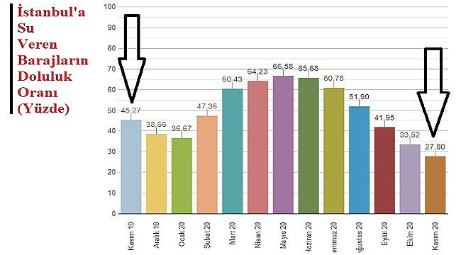 Yaz aylarını sorunsuz atlatan İstanbul’a su veren barajlar, alarm vermeye başladı. 13 Kasım 2020 itibariyle İstanbul’daki barajlarda doluluk oranı yüzde 27,80’e geriledi. Bu rakam 19 Kasım 2019 tarihinde yüzde 45,27 idi. Bir diğer ifadeyle İstanbul’un barajlarında su seviyesi (Bolluğu) daha iyi bir seviyede idi. Bu yılın 20 Mayıs günü ise İstanbul’daki barajların doluluk oranı yüzde 66,58 ile rekor kırmıştı.Barajlarda ki doluluk oranındaki düşüş, kış aylarında yağacak kar ve yağmurlara bağlı. Kışın yeterince kar ve yağmur yağmaması halinde gelecek yaz için İstanbul’da su krizi yüksek bir ihtimal.