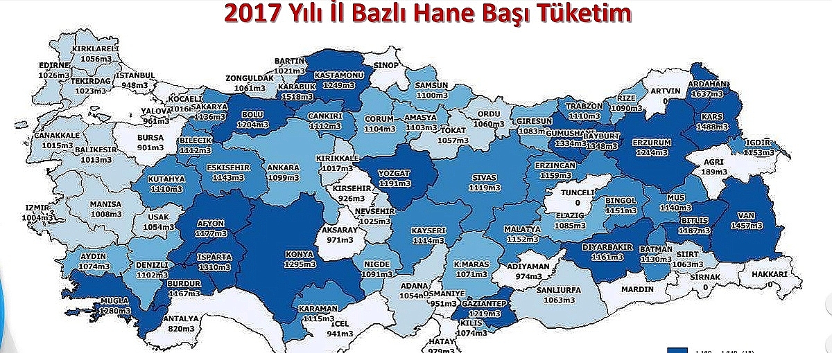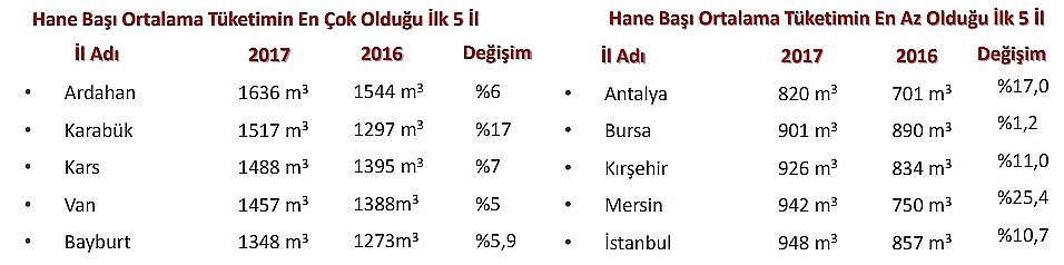 - 2017 yılında hane başı tüketimin en yüksek olduğu il 1634 m3/yıl ile Ardahan, en düşük olduğu il ise 820 m3 ile Antalya olmuştur. İstanbul’da hane başı tüketim 948 m3, Ankara'da ise 1099 m3/yıl ortalama hane tüketimi gerçekleşmiştir.