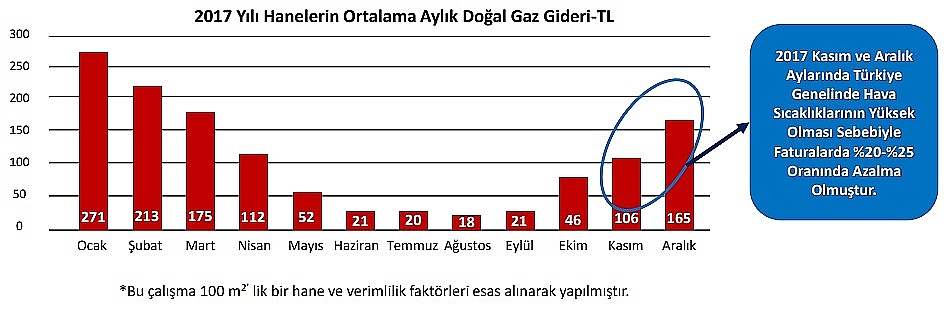 - 2017 yılında doğal gazla ısınan ortalama bir hane için 1220 TL maliyet oluşmuştur. Aynı kaloriyi kömür ile 1737 TL’ye Fuel-oil ile 2999 TL ile elde etmek mümkün olabilmektedir. Dolayısıyla evsel kullanımda doğal gaz en ucuz kaynaktır. 2017 yılı Kasım ve Aralık aylarında konut doğal gaz faturalarında % 25 azalma olmuştur.
