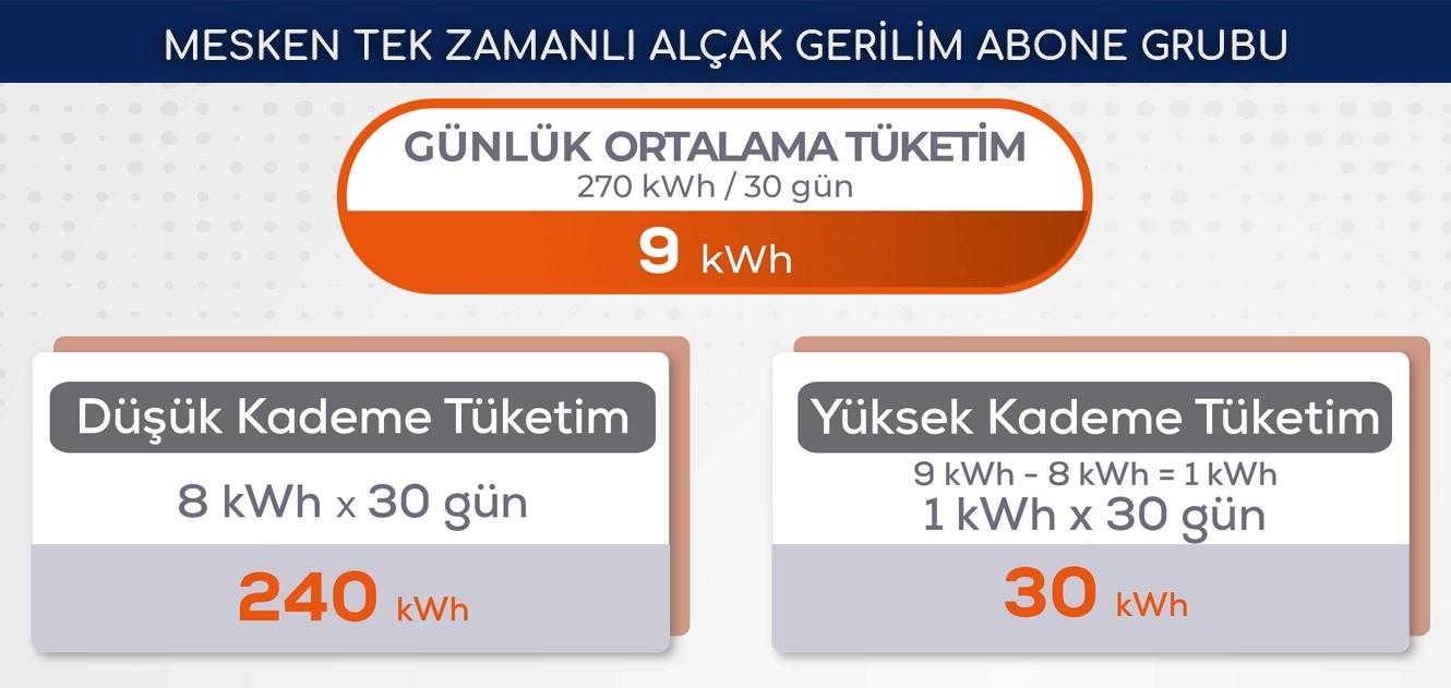 Mesken alçak gerilim tek zamanlı abone grubu için, günlük ortalama 8 kWh’ya kadar olan tüketimler Düşük Tüketimli Kademe'den, 8 kWh üzeri olan tüketimler ise Yüksek Tüketimli Kademe’ den hesaplanmaktadır.Kademeli Tarifede Tüketim Sınırı Ne Kadar?