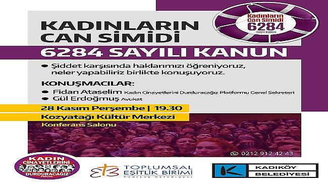 Kadıköy Belediyesi 6284 sayılı Ailenin Korunması ve Kadına Karşı Şiddetin Önlenmesine Dair Kanunun etkili olarak kullanılması ve kadınların şiddete karşı haklarının ne olduğunu bilmeleri için yürüttüğü farkındalık çalışmalarına, “Kadınların Can Simidi 6284 Sayılı Kanun” başlıklı panele ev sahipliği yaparak devam ediyor.Kadıköy Belediyesi Toplumsal Eşitlik Birimi ve kadın Cinayetlerini Durduracağız Platformu’nun düzenlediği panelde kadına yönelik şiddetle mücadele, şiddete uğrayan veya şiddete uğrama tehlikesi bulunan kadınların, çocukların, aile bireylerinin ve tek taraflı ısrarlı takip mağduru kişilerin korunmasını amaçlayan “6284 sayılı Ailenin Korunması ve Kadına Karşı Şiddetin Önlenmesine Dair Kanun” ele alınacak. 28 Kasım Perşembe saat 19:30’da Kozyatağı Kültür Merkezi’nde gerçekleşecek panelde Kadın Cinayetlerini Durduracağız Platformu Genel Sekreteri Fidan Ataselim ve Avukat Gül Erdoğmuş konuşmacı olarak yer alacak.Kadıköy Belediyesi’nin kadın çalışanları “25 Kasım Kadına Yönelik Şiddete Karşı Uluslararası Mücadele Günü” kapsamında Kadıköy’ün sokak ve caddelerinde “6284?”, “6284 nedir?” şeklinde afiş, yazılama ve grafiti çalışmaları yaparak merak uyandırmıştı. 25 Kasım günü ise 6284 sayılı yasayı rap müzik eşliğinde hazırlanan bir video ile tanıtmış, cadde ve sokaklarda 6284 sayılı kanuna yönelik bilgilendirme çalışmaları yürütmüştü.TP