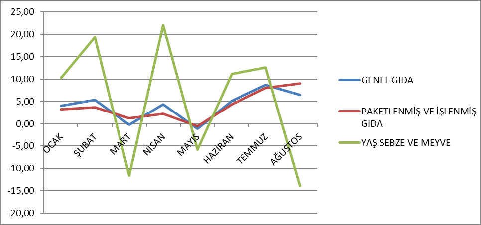 Paketlenmiş ve işlenmiş gıda ürünlerindeki artış yüzde 9,04, yaş sebze ve meyvedeki artış oranı yüzde -13,91 oldu.