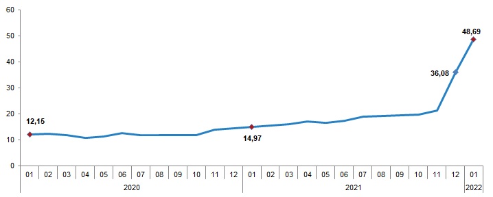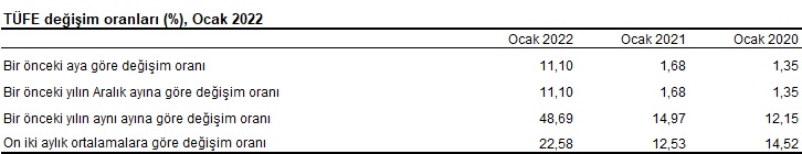 TÜFE'de (2003=100) 2022 yılı Ocak ayında bir önceki aya göre %11,10, bir önceki yılın Aralık ayına göre %11,10, bir önceki yılın aynı ayına göre %48,69 ve on iki aylık ortalamalara göre %22,58 artış gerçekleşti.