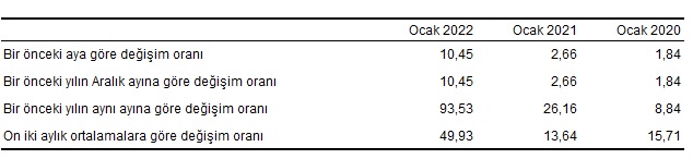 Yİ-ÜFE (2003=100) 2022 yılı Ocak ayında bir önceki aya göre %10,45 bir önceki yılın Aralık ayına göre %10,45, bir önceki yılın aynı ayına göre %93,53 ve on iki aylık ortalamalara göre %49,93 artış gösterdi.