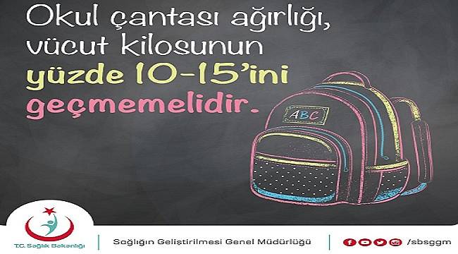 Okul çantasında dengeyi bir türlü tutturamıyoruz. Öğrenciler her ghün kilolarca ağırlığı (Defter, kitap vb) çantasında taşıyor. Peki, bu işin bir kriteri, ölçüsü yok mu? Var tabi. Hem de sağlık bakanlığı hesağladı.VÜCUT AĞIRLIĞININ YÜZDE 10-15'İNİ AÇMAMALISağlık Bakanlığı Sağlığın Geliştirilmesi Genel Müdürlüğü'nün okul çantalarıyla ilgili bilgilendirmesi şöyle: Okul çantasının fazla ağır olması ve yanlış pozisyonda taşınması, vücudun çeşitli bölgelerinde ağrılara ve kalıcı duruş bozukluklarına yol açabilir.Okul çantası ağırlığı, vücut kilosunun yüzde 10-15'ini geçmemelidir. (TP)