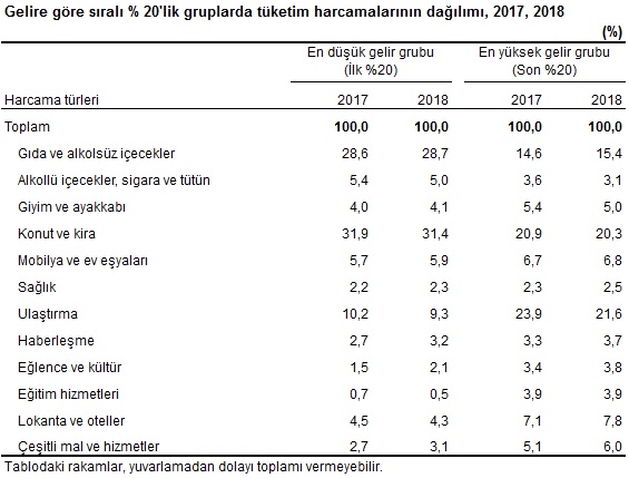 Gelire göre sıralı %20'lik gruplar itibarıyla tüketim harcamalarının 2018 yılındaki dağılımına bakıldığında; en düşük gelir grubu olan birinci %20'lik grupta yer alan hanehalkları, konut ve kira harcamalarına %31,4, gıda ve alkolsüz içecek harcamalarına %28,7, ulaştırma harcamalarına %9,3 ve mobilya ve ev eşyası harcamalarına %5,9 pay ayırdı.
