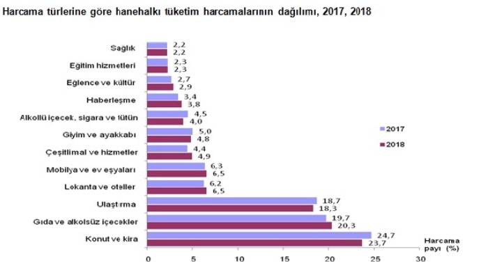 Hanehalkı bütçe araştırmasının 2018 yılı sonuçlarına göre; Türkiye genelinde hanehalklarının tüketim amaçlı yaptığı harcamalar içinde en yüksek payı %23,7 ile konut ve kira harcamaları alırken, ikinci sırayı %20,3 ile gıda ve alkolsüz içecek harcamaları aldı. Toplam tüketim harcamalarında en düşük payı alan harcama grupları ise %2,2 ile sağlık ve %2,3 ile eğitim hizmetleri oldu.