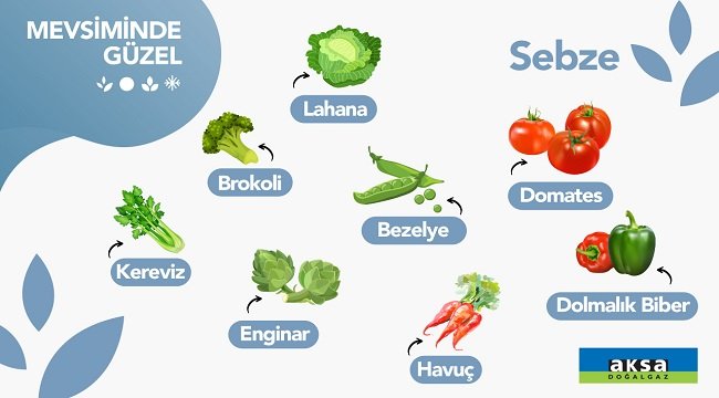 Lahana, Domates, Bezelye, Kereviz, Dolmalık Biber, Enginar, Havuç, Brokoli.