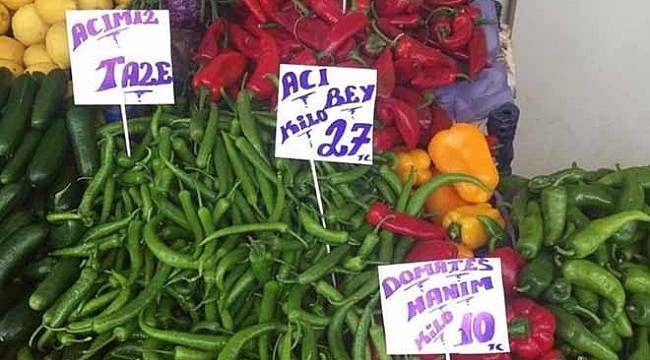 Sivribiber fiyatları rekor üzerine rekor kırıyor. Sivribiber Didim’de “Acımız Taze” ve “Acı Bey” etiketleriyle kilosu 27 TL’den satışa sunuldu.Sivribiber Aydın'ın Didim ilçesinde 27 liraya fırladı. Sebzeler de rekor üzerine rekor kırınca market sahibi sivribiberi “Acımız Taze”, “Acı Bey”, domatese “Domates Hanım” etiketleriyle satmaya başladı.ACIMIZ TAZE; FİYATI 27 TLFiyatın bu kadar yükselmesine birer de espri katan market sahibi “Acımız Taze” ve “Acı Bey kilo 27 TL” etiketleriyle satışa sundu.Kırmızı Kapya biber “Biber Bey Kilo 18 TL”, “Domates Hanım Kilo 10 TL” ve “Biber Bey Kilo 18” etiketleriyle dikkat çekmeyi başardı.Market sahibi fiyatlarla ilgili bir açıklama yapmadı. (Sözcü)