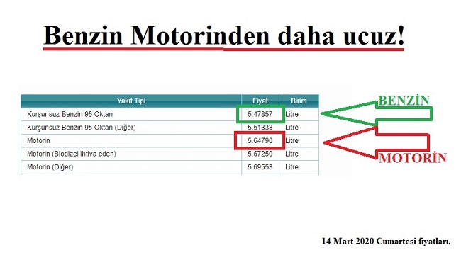 Tüketiciler – sürücüler genelde, benzinin motorine göre daha pahalı satış fiyatına alışmıştı. Ancak son fiyat dalgalanmaları ve indirimlerle birlikte, ‘motorin’ benzinden daha pahalı satılmaya başlandı. EPDK verilerine göre (14 Mart 2020 Cumartesi ortalama fiyatlar), istasyonlarda 1 litre benzin (95 oktan) 5,47 TL’ye satılırken aynı istasyonda 1 litre motorin 5,64 TL’ye satılmaya başlandı.HAM PETROLDE SÜRPRİZ YAPTI!Suudi Arabistan devlet petrol şirketi Aramco’nun petrol üretim sahalarına yapılan terörist saldırlar ve sonrasında ABD – İran siyasi gerginliğiyle, ham petrolün varil fiyatı 60 – 70 dolar rakamlarına çıktı. Ancak iki ülke arasındaki siyasi gerginlik kısa sürede soğudu. Buna ilave Çin’de ortaya çıkan Koronavirüs’le birlikte petrol tüketimi önce Çin ve sonrasında virüsün diğer ülke yayılmasıyla da dünya ekonomisi bundan olumsuz etkilendi. Bu durum ise, petrol tüketimini olumsuz etkiledi. Ve ham petrol fiyatları hızlı düşüşe geçti. Son olarak Suudi Arabistan – Rusya arasında petrol üretimi konunda yaşanan gerginlik ve Suudilerin petrol üretiminde artışa gitmesi, ham petrol fiyatlarındaki düşüşü iyice hızlandırdı. Ve ham petrol fiyatları, uzun yıllar sonra 30 dolar seviyelerine geriledi.BENZİN ARTIK DAHA UCUZ!Ham petroldeki düşüş, iç pazarda akaryakıt fiyatlarına (Benzin, motorin, LPG) indirim olarak yansımaya başladı. Hızlı indirimler; istasyonlarda ‘En pahalı benzin satılır’ imajını da yıkarak, benzin fiyatlarını motorin fiyatlarının gerisine çekti.Açıklama: Akaryakıt fiyatları, Enerji Piyasası Düzenleme Kurumu (EPDK) en yüksek işlem hacimli 8 firmanın ortalama bayi satış fiyatlarıdır (Kaynak: www.tuketicitv.com).