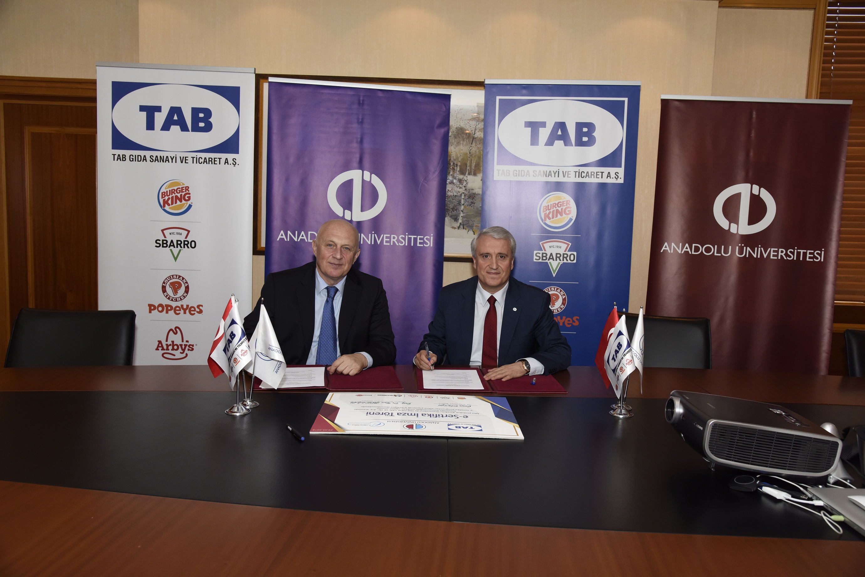 Anadolu Üniversitesi işbirliğiyle gerçekleşen e-sertifikalı “Geleceğin Yöneticileri” eğitim programı için düzenlenen imza töreni TAB Gıda Genel Müdürü Caner Dikici, tab gıda Genel Müdür Yardımcısı Gökhan Asok, TAB Gıda İnsan Kaynakları Koordinatörü Lütfi Seyrekel, TAB Gıda İnsan Kaynakları Müdürü Burcu Erdemir ve Anadolu Üniversitesi Rektörü Prof. Dr. Naci Gündoğan’nın katılımıyla, 29 Mayıs 2018 tarihinde Anadolu Üniversitesi’nde gerçekleşti.Geleceğin Yöneticileri eğitim programı, 5 farklı e-sertifika modülünden oluşuyor. Bu eğitim sistemi ile TAB Gıda’nın sunduğu kariyer fırsatlarından tüm TAB Gıda çalışanları özellikle de eğitim hayatını yarıda bırakmış; ortaokul mezunu olanlar da yararlanabilecek.Anadolu Üniversitesi ile yapılan işbirliği çerçevesinde düzenlenen imza töreninde değerlendirmede bulunan Caner Dikici, “Bugün burada gerçekleştirdiğimiz işbirliği ile birlikte TAB Gıda çatısı alında bulunan tüm çalışanlarımıza geleceğin yöneticileri olma imkânı sağlıyoruz. TAB Gıda bünyesindeki TAB Akademi ile yıllardır hem kendi şirketimiz hem de ülkemiz için geleceğin liderlerini yetiştirmek amacıyla çalışanlarımızı destekliyoruz. TAB Akademi'nin en büyük özelliği olan e-öğrenme alt yapısında edindiğimiz tecrübe sayesinde bugün Anadolu Üniversitesi ile e-sertifikalı “Geleceğin Yöneticileri” eğitim programını gerçekleştirebiliyoruz. “Level Up” adını verdiğimiz bu eğitim programı sayesinde tüm çalışanlarımız belirli modüllere katılarak kariyerini geliştirme fırsatı yakalayabilecek” dedi.Anadolu Üniversitesi Rektörü Prof. Dr. Naci Gündoğan, imzalanan eğitim protokolüne ilişkin görüşlerini şu şekilde dile getirdi: “Anadolu Üniversitesi olarak kamu ve özel sektördeki tüm kuruluşlarla eğitim iş birliği protokolleri imzalıyoruz. Üniversitemizin genellikle kamu kuruluşlarıyla iş birlikleri bulunuyor ve bunların çoğunu da bakanlıklarla yapılan eğitim iş birlikleri oluşturuyor. Bunun yanında, Türkiye’nin önde gelen özel sektör kuruluşları da özellikle personellerinin hizmet içi eğitimleriyle ilgili olarak bizden destek istiyorlar. Bu kapsamda, bugün TAB Gıda Sanayi ve Ticaret A.Ş. ile bir eğitim iş birliği anlaşması yaptık. Bundan sonra kendileri, personellerinin terfilerinde bizim sertifika programlarımızın sonuçlarını kullanacaklar. Üniversiteler, ülkede eğitim talep eden her kesimin ihtiyaçlarına cevap vermek durumundadırlar. Anadolu Üniversitesi de ‘yaşam boyu öğrenme’ vizyonu kapsamında kamu-özel sektör ayrımı yapmadan eğitim talep eden herkese olanaklarını sunuyor. Bu vesileyle tüm TAB Gıda Sanayi ve Ticaret A.Ş. çalışanlarına başarılar diliyorum.”