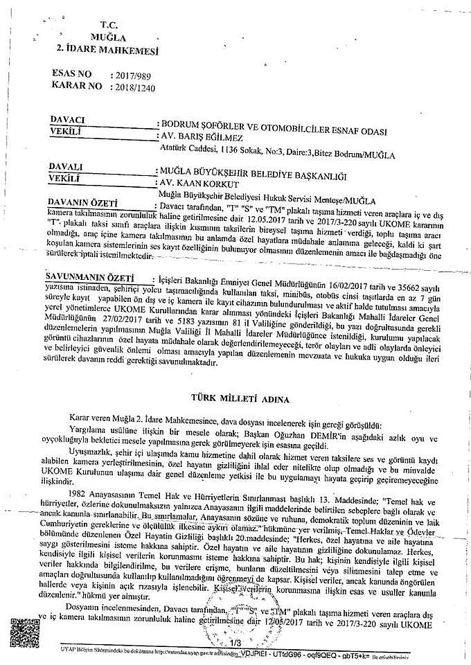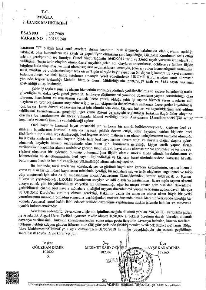 Nejla SakınmazBodrum Şoförler Odası itiraz ettiMuğla Büyükşehir Belediyesi UKOME tarafından da genelge kapsamında taksilere görüntülü ve sesli kamera takılmasının zorunlu olduğuna dair karar alınmasının ardından, Bodrum Şoförler Odası tarafından Muğla 2. İdare Mahkemesine kararın iptali için dava açıldı. mahkeme heyeti davayı karara bağlayarak, taksilere konulacak ses ve görüntü kaydı alan kamera sistemlerinin taşıma hizmeti veren ve alan kişilerin özel hayatlarına müdahale içerdiğine karar verdi.Ancak kanunla yapılabilirHeyet kararında, yapılan müdahalenin suç ve terör olaylarını engellemek ve takip edip araştırmak için dahi olsa ancak Anayasanın 13. maddesindeki şartları sağlayacak bir kanun hükmü ile yapılabileceğini belirtilerek, şu görüşlere yer verdi:"UKOME Kurulunun, asayişin ve adli olayların araştırılması üzere toplu taşıma sistemi dizayn etmek yükümlülüğü ve yetkisinin bulunmadığı, eğer bu meşru araca göre de olsa dahi düzenleme getirilmesi için özel hayata müdahale niteliği taşıyan düzenlemeyi yapma yetkisinin açıkça davalı idareye ve UKOME kuruluna verilmiş olması gerektiği, Bakanlık yazısı ile amaç ne olursa olsun böyle bir yetki yaratılmasının mümkün olmadığı sonucuna varıldığından, dava konusu işlemin iptaline karar verildi."“Özel hayat ve kamusal hayat arasındaki sınır kesin olarak belirlenemez”Muğla 2. İdare mahkemesinin verdiği kararda özel hayatın sınırlanamaz ve mahremiyetinin güvenlik nedeniyle bile olsa ihlal edilemez olduğu vurgusu yapıldı.Mahkeme kararında özel hayat ve kamusal hayat arasındaki sınırın kesin olarak belirlenemeyeceğine vurgu yapılarak kişilerin özel ve mahrem hayatlarının kamusal alana da taşacak şekilde devam ettiği, şehir hayatına katılan kişilerin özel ilişkilerinin toplu alanlarda da süreceği, özel hayatın sadece mahrem alan olarak anlaşılmasının mümkün olmadığı belirtildi. Bu itibarla kişilerin kamusal hayatın içinde hala özel hayatlarının devam ettiği ve hayatın olağan akışına aykırı olmamak kaydıyla kişinin mahreminde olan biten gibi korunması gerektiği ifade edilerek şöyle dendi:“Kişiye tercih yapma fırsatı verilmeksizin kapalı bir alanda sesinin ve görüntüsünün sürekli kayıt altına alınmasının ve görüntüsü ve sesiyle suç şüphesi oluşturan bir eylemde bulunup bulunmadığına ilişkin olarak sürekli tehdit altında bırakılmasının, izlenmesinin ve denetlenmesinin özel hayatı ilgilendirdiği ve kişilerin hareketlerinde sadece kamusal hayatta bulunmasının ötesinde kendini engelleme yükümlülüğü altına sokacağı açıktır.Bu durumda, taksi araçlarına konulacak ses ve görüntü kaydı alan kamera sistemlerinin, taşıma hizmeti veren ve alan kişilerim özel hayatlarına müdahale içerdiği, bu müdahale suç ve terör olaylarını engellemek ve takip edip araştırmak için olsa da bu ancak Anayasanın 13. Maddesindeki şartları sağlayacak bir kanun hükmü ile yapılabilir.”“UKOME’nin toplu taşıma sistemi dizayn etme yükümlülüğü yok” Mahkeme kararında, UKOME Kurulu’nun asayişin ve adli olayların araştırılması üzere toplu taşıma sistemi dizayn etmek gibi bir yükümlülüğü ve yetkisinin bulunmadığı belirtildi.