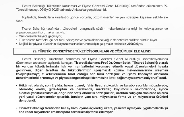 - ''Ticaret Bakanlığı, 29. Tüketici Konseyi Toplantısı Sonucunda, Tüketicilerin Haklarını Güçlendirme Yolunda Yeni Bir Yol Haritası Belirliyor.''
