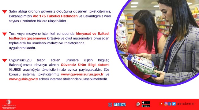 'Satın aldığı ürünün güvensiz olduğunu düşünen tüketicilerimiz, Bakanlığımızın Alo 175 Tüketici Hattından ve Bakanlığımız web sayfası üzerinden bizlere ulaşabilirler.'