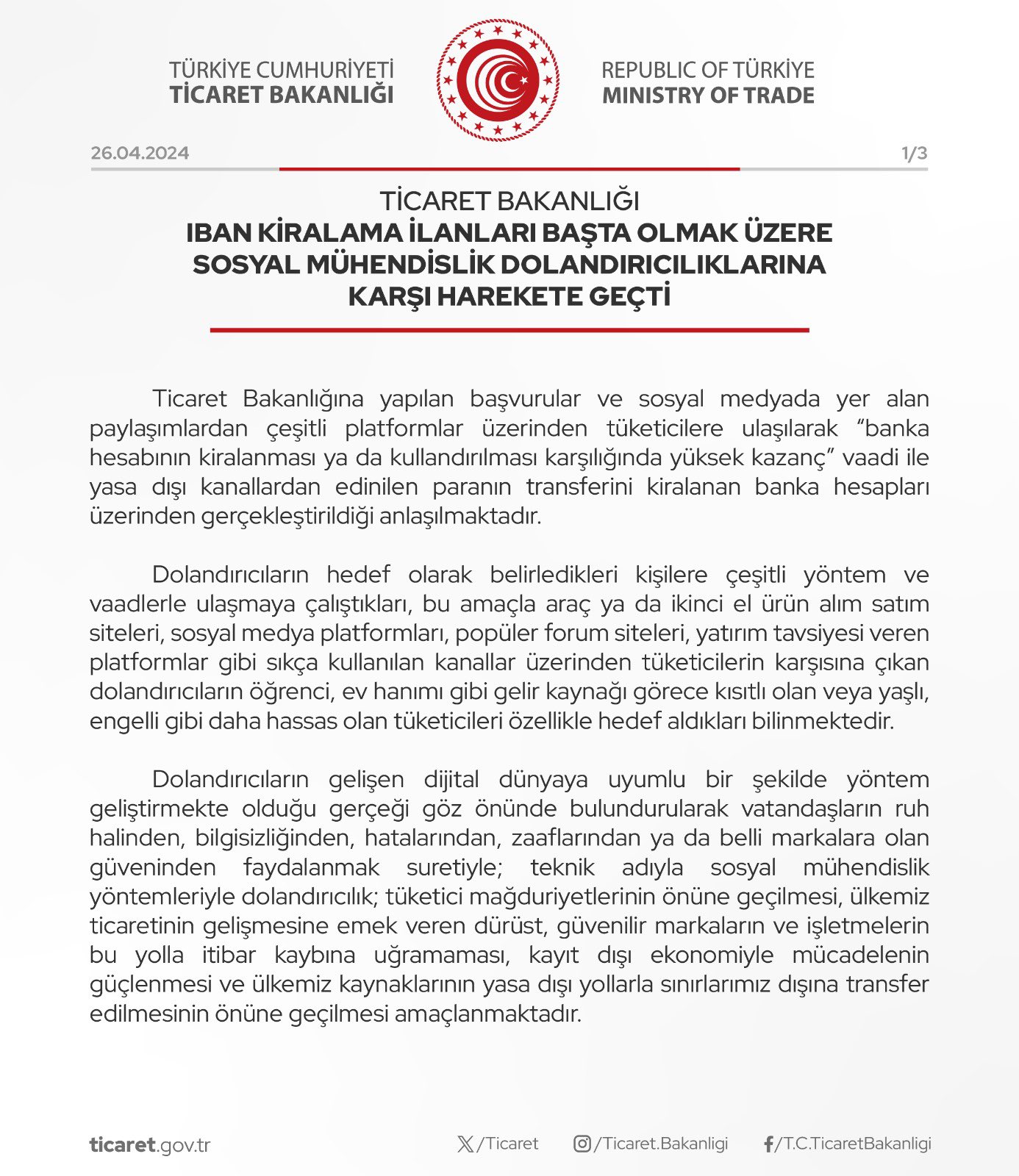 Ticaret Bakanlığı gönderi yayınladı: Ticaret Bakanlığı IBAN kiralama ilanları başta olmak üzere sosyal mühendislik dolandırıcılıklarına karşı harekete geçti