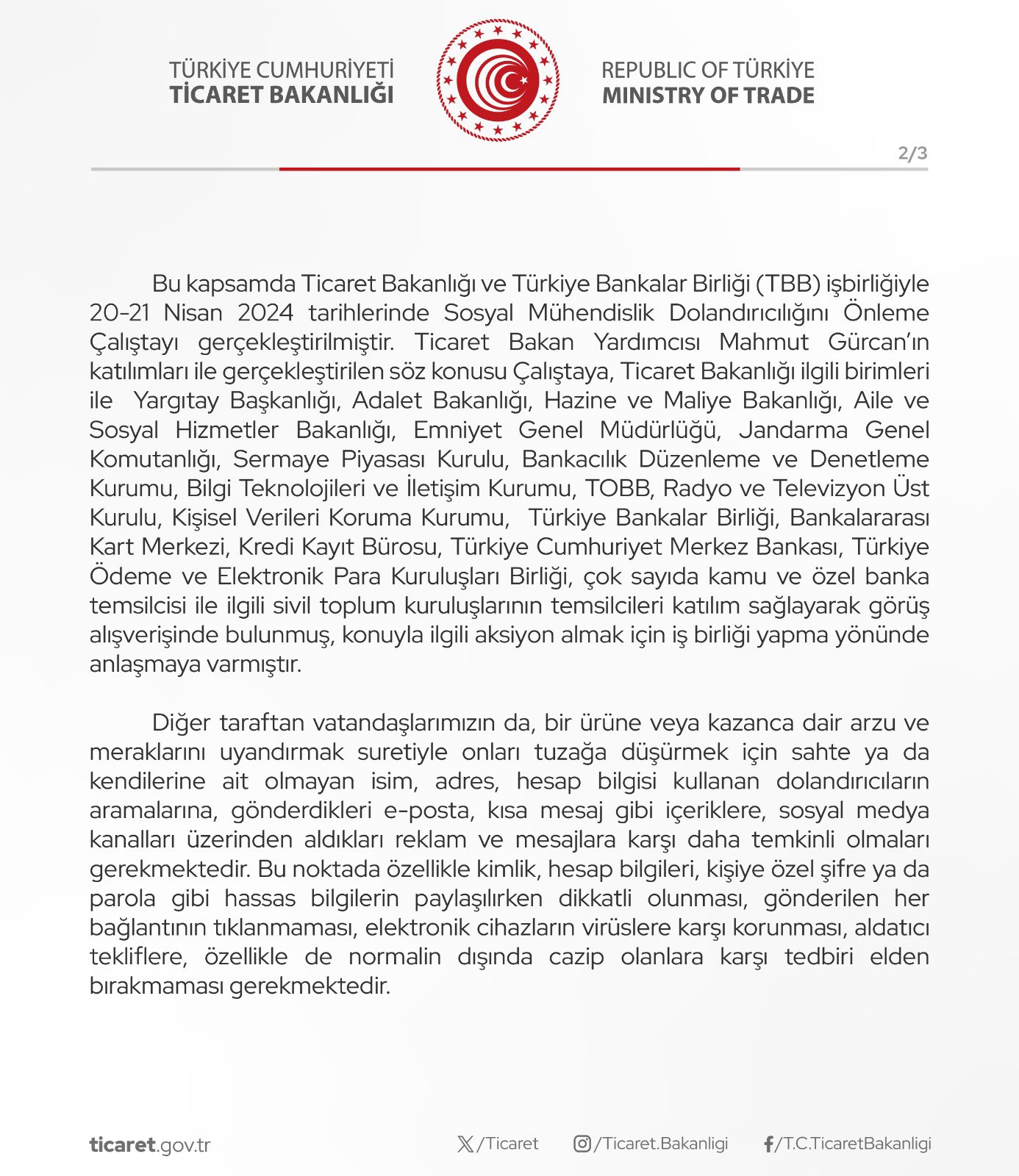 Dolandırıcıların gelişen dijital dünyaya uyumlu bir şekilde yöntem geliştirmekte olduğu gerçeği göz önünde bulundurularak vatandaşların ruh halinden, bilgisizliğinden, hatalarından, zaaflarından ya da belli markalara olan güveninden faydalanmak suretiyle; teknik adıyla sosyal mühendislik yöntemleriyle dolandırıcılık; tüketici mağduriyetlerinin önüne geçilmesi, ülkemiz ticaretinin gelişmesine emek veren dürüst, güvenilir markaların ve işletmelerin bu yolla itibar kaybına uğramaması, kayıt dışı ekonomiyle mücadelenin güçlenmesi ve ülkemiz kaynaklarının yasa dışı yollarla sınırlarımız dışına transfer edilmesinin önüne geçilmesi amaçlanmaktadır.Bu kapsamda Ticaret Bakanlığı ve Türkiye Bankalar Birliği (TBB) işbirliğiyle 20-21 Nisan 2024 tarihlerinde Sosyal Mühendislik Dolandırıcılığını Önleme Çalıştayı gerçekleştirilmiştir. Ticaret Bakan Yardımcısı Mahmut Gürcan'ın katılımları ile gerçekleştirilen söz konusu Çalıştaya, Ticaret Bakanlığı ilgili birimleri ile Yargıtay Başkanlığı, Adalet Bakanlığı, Hazine ve Maliye Bakanlığı, Aile ve Sosyal Hizmetler Bakanlığı, Emniyet Genel Müdürlüğü, Jandarma Genel Komutanlığı, Sermaye Piyasası Kurulu, Bankacılık Düzenleme ve Denetleme Kurumu, Bilgi Teknolojileri ve İletişim Kurumu, TOBB, Radyo ve Televizyon Üst Kurulu, Kişisel Verileri Koruma Kurumu, Türkiye Bankalar Birliği, Bankalararası Kart Merkezi, Kredi Kayıt Bürosu, Türkiye Cumhuriyet Merkez Bankası, Türkiye Ödeme ve Elektronik Para Kuruluşları Birliği, çok sayıda kamu ve özel banka temsilcisi ile ilgili sivil toplum kuruluşlarının temsilcileri katılım sağlayarak görüş alışverişinde bulunmuş, konuyla ilgili aksiyon almak için iş birliği yapma yönünde anlaşmaya varmıştır.