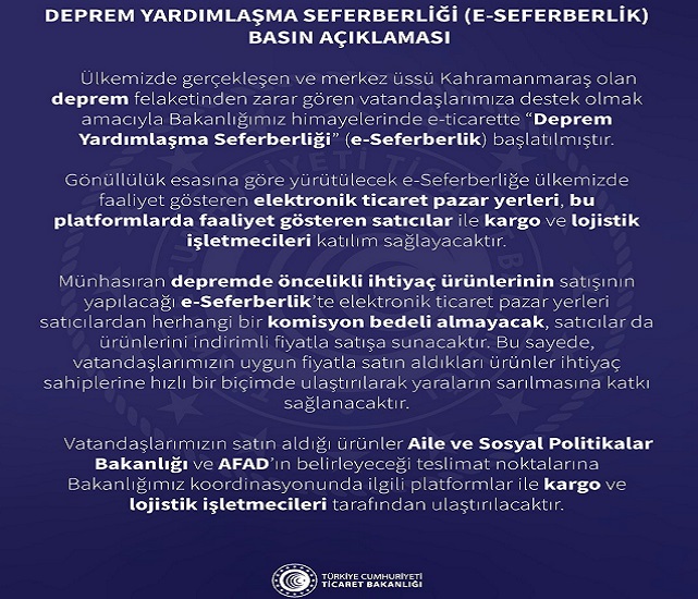 Ticaret Bakanlığı, bu önemli gelişmeyi ''Ticaret Bakanlığımız koordinasyonunda e-ticarette Deprem Yardımlaşma Seferberliği başlatılmıştır. Kamuoyuna saygı ile duyurulur.'' başlığıyla duyurdu.
