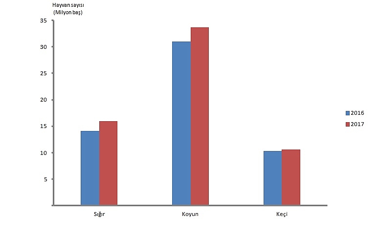 Büyükbaş hayvan sayısı 2017 yılında bir önceki yıla göre yüzde 13,2 artarak 16 milyon 105 bin baş olarak gerçekleşti. Büyükbaş hayvanlar arasında yer alan sığır sayısı yüzde 13,2 artarak 15 milyon 944 bin baş olurken, manda sayısı yüzde 13,6 artış ile 161 bin 439 baş olarak gerçekleşti.