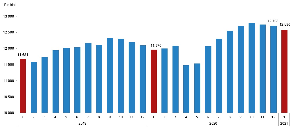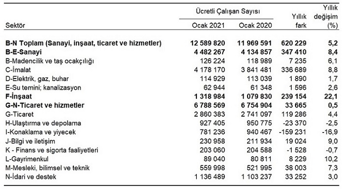 Sanayi, inşaat ve ticaret-hizmet sektörleri toplamında ücretli çalışan sayısı 2021 Ocak ayında bir önceki yılın aynı ayına göre %5,2 arttı. Ücretli çalışan sayısı bir önceki yılın aynı ayında 11 milyon 969 bin 591 kişi iken, 2021 yılı Ocak ayında 12 milyon 589 bin 820 kişi oldu.Ücretli çalışanların alt detaylarına bakıldığında; 2021 yılı Ocak ayında ücretli çalışan sayısı yıllık olarak sanayi sektöründe %8,4, inşaat sektöründe %22,1 ve ticaret-hizmet sektöründe %0,5 arttı.