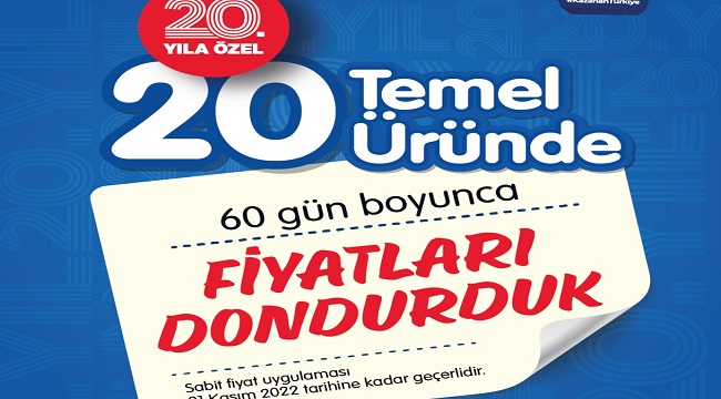 20’nci kuruluş yılını kutlayan Bizim Toptan; kaliteli ve uygun fiyatlı ürünleriyle müşterilerinin yanında olmaya devam ederken sabit fiyat kampanyasıyla da Türkiye perakende sektöründe önemli bir adım atıyor. Bizim Toptan, 20’nci yılına özel 20 temel üründe 60 gün boyunca fiyatları dondurdu. Bizim Toptan; ayçiçek yağı, makarna, deterjan ve tereyağı gibi temel ürünleri kapsayan karar çerçevesinde 60 gün boyunca herhangi bir fiyat değişikliğine gitmeyecek.