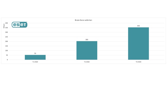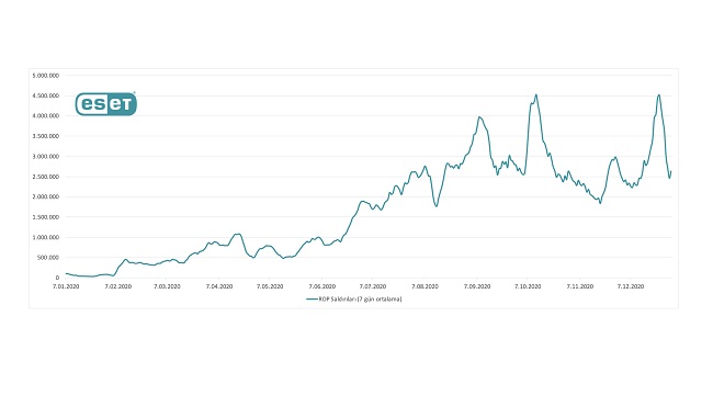 Her ölçekten şirket saldırı kurbanı oldu Brute force (kaba kuvvet) saldırısı, hacker’ların bir hesaba erişebilmek için deneme-yanılma yöntemi kullanmasına deniliyor. Bu saldırı türü bir web sitesinin arka planına erişim sağlamak ve önemli bilgileri ele geçirmek amacıyla parolaların kırılması için kullanılır. Her ölçekten şirket hedef olabiliyor. ESET’in 2020 yılı 4. Çeyrek Tehdit Raporu’na göre 2020 yılı içerisinde dünya genelindeki RDP saldırılarında yüzde 768’lik artış gerçekleşti. Bu oran Türkiye’ye yönelik gerçekleştirilen saldırılar için yüzde 571. ESET, 2020 yılı içerisinde Türk şirketlere gerçekleştirilen 609 Milyon brute-force saldırısı tespit etti. Bu saldırılarda 14.500 şirket hedef alındı. Şirket ağına sızıp verileri şifreliyorlar RDP saldırıları genellikle şirketlerin iç ağlarına sızarak fidye yazılım saldırısı düzenlemek veya şirketlerin hassas bilgilerini sızdırmak ve rakip şirketlere pazarlamak amacı ile kullanılıyor. Bu tür saldırılar zararlı yazılımlar yerine doğal yöntemlerle gerçekleştirildiği için oldukça etkili oluyorlar. Saldırgan sisteme sızdıktan sonra kendisini yetkilendirerek uç nokta korumalarını devre dışı bırakabilir, exception ekleyebilir ve daha sonra zararlı yazılımları çalıştırmaya başlayabilir. Sistem üzerinde kripto madencilik yazılımı çalıştırmaktan, fidye zararlıları ile verileri şifreleyerek yedek dosyalarını silmeye kadar birçok zararlı faaliyet sergileyebilir. Şirket ağı içerisinde aylarca kalarak siber casusluk amaçlı veri hırsızlığı yapabilir ve bu süre içerisinde hiç fark edilmeyebilir.