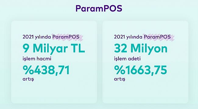 - ParamPOS ile yapılan işlem hacmi geçen yılın aynı dönemine göre yüzde 438 artışla 9 milyar TL’ye, işlem adedi yüzde 1663 artışla 32 milyona ulaştı.