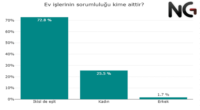 Neredeyse her 4 katılımcıdan 3'ü ev işlerinde sorumluluğun paylaşılması gerektiğini düşünüyor. Her 4 katılımcıdan 1'i ise sorumluluğun kadına ait olduğu görüşünde. Erkeklerin sorumlu olduğunu belirtenlerin oranı ise oldukça az.