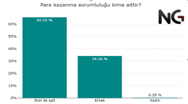 Her 3 kişiden 2'si para kazanmanın eşlerin ortak sorumluluğu olduğunu söylerken sadece kadınların sorumluluğu diyenler yok denecek kadar az.
