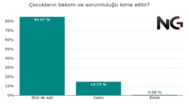 Her 20 kişiden 17'si çocukların bakımı ve sorumluğunun ortak olması gerektiğini düşünürken, 3'ü ise bu sorumluluğun anneye ait olduğunu düşünüyor. Erkek diyenler ise oldukça az.