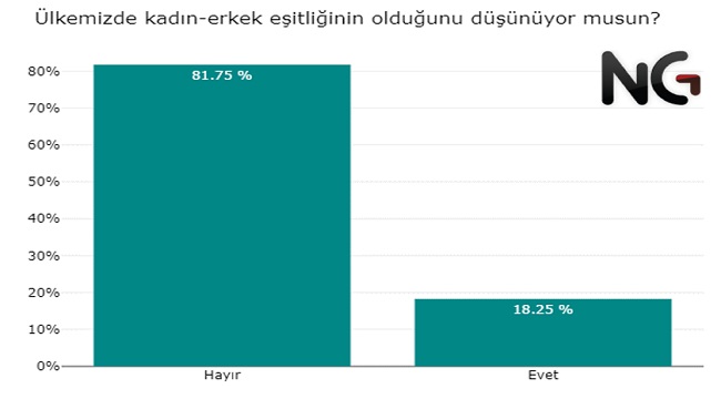 Araştırmaya katılan her 10 kişiden 8’i ülkemizde kadın-erkek eşitliği olmadığını düşünürken, 2’si ise eşit olduklarını düşünüyor.